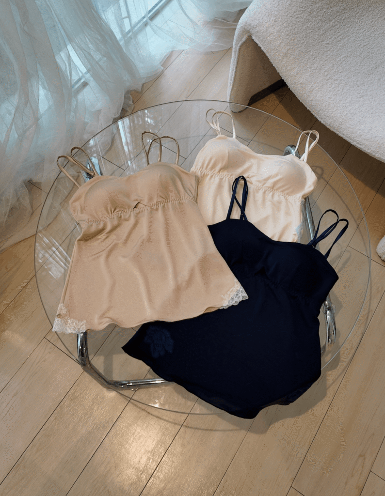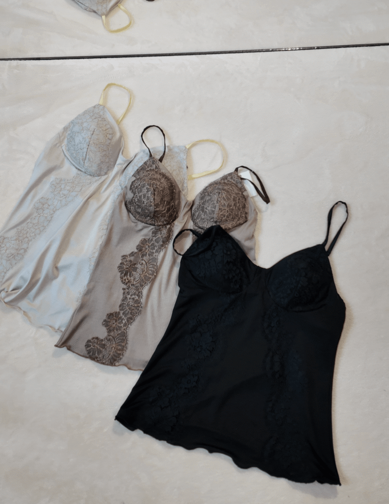 以前オーダーしたシルクジャージー素材のブラキャミがとても良かったので、今回は同じデザインで丈を伸ばしたカップ付きスリップを4枚オーダーしました。そして、色違いでソフトブラとキャミソールも1枚ずつリピートしました。スリップはサイドにレースがあしらわれており、見えても悪目だちのない黒やベージュの上品なシルク生地がとても気に入っています。ブラは見ているだけで癒されるラベンダーカラーを。キャミソールは使いやすい黒でオーダーしました。