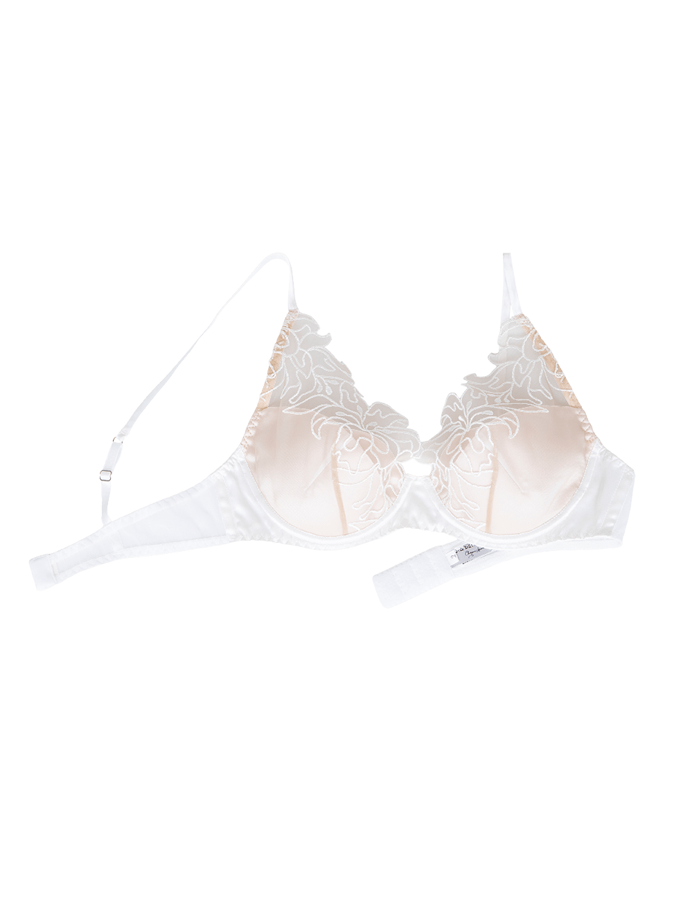 • シルエット:幾重にも重なった花びらをイメージしたカップの構造。2重のパッドが胸を包み、自然の丸みを強調しながらしっかりと支える。前中心は浅く、ワイヤーの当たりは気にならない。トップの位置がとても高い方は中のカップの上から出る可能性があるが、レースの模様が強いのでそこまで目立たない。ブラ表面のレースは面積広めにとってあるため、胸元が開いたトップスの中にレイヤーし、レース先をファッションの一部として楽しむのをおすすめ。