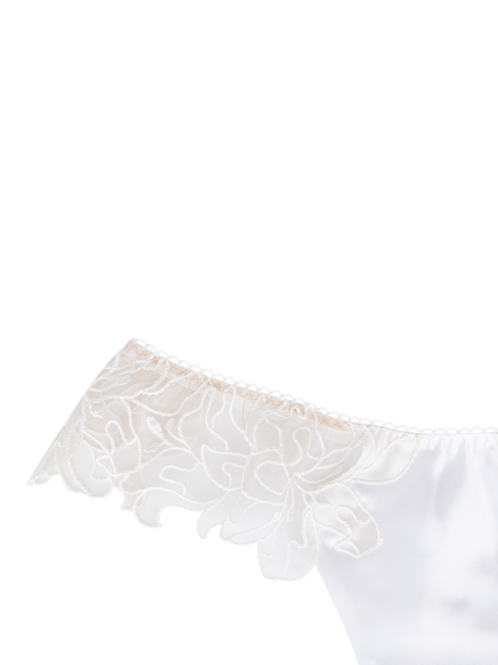 デザイナー手書きのデッサンをレースの模様に落とし込んだ、made in Japan の刺繡レースに合わせるのは、イギリス製100%シルク。GREYとSKYはマットシルク、NAVY、WHITE、DUSKY、MINK は艶のあるシルクサテンと二つの質感を楽しめます。